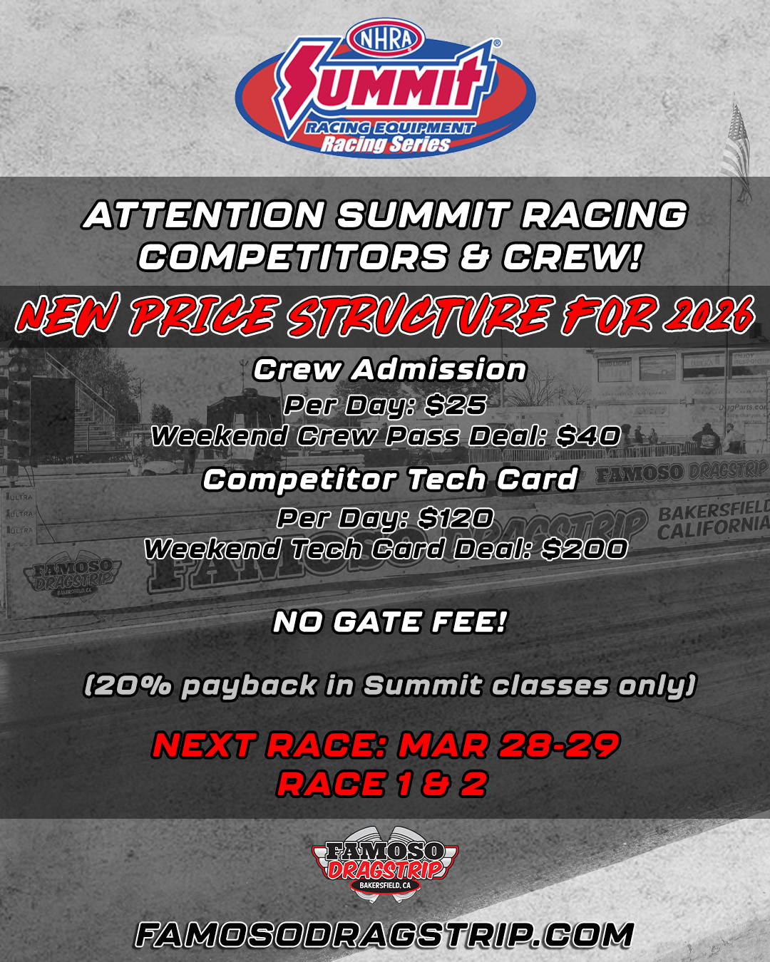 The 2026 season is kicking off with the season opener at Famoso Dragstrip March 28-29 and there’s a new price structure with weekend deals that you should know about!